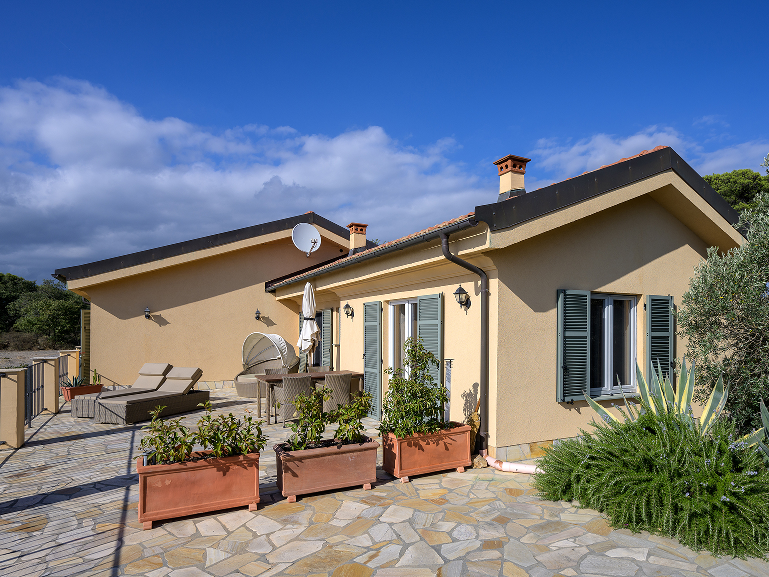 Es erwartet Sie eine wunderschön gelegene Ferienanlage mit italienischem Charme. Drei Premium-Apartments mit eigener Terrasse laden zum Entspannen ein. Die ruhige Lage, der freie Blick auf die Küste und die gehobenen Ausstattung bieten ein einmaliges Urlaubserlebnis – zu jeder Jahreszeit. Kommen Sie an die Blumenriviera und genießen Sie Sonne, Meer und gutes Essen.