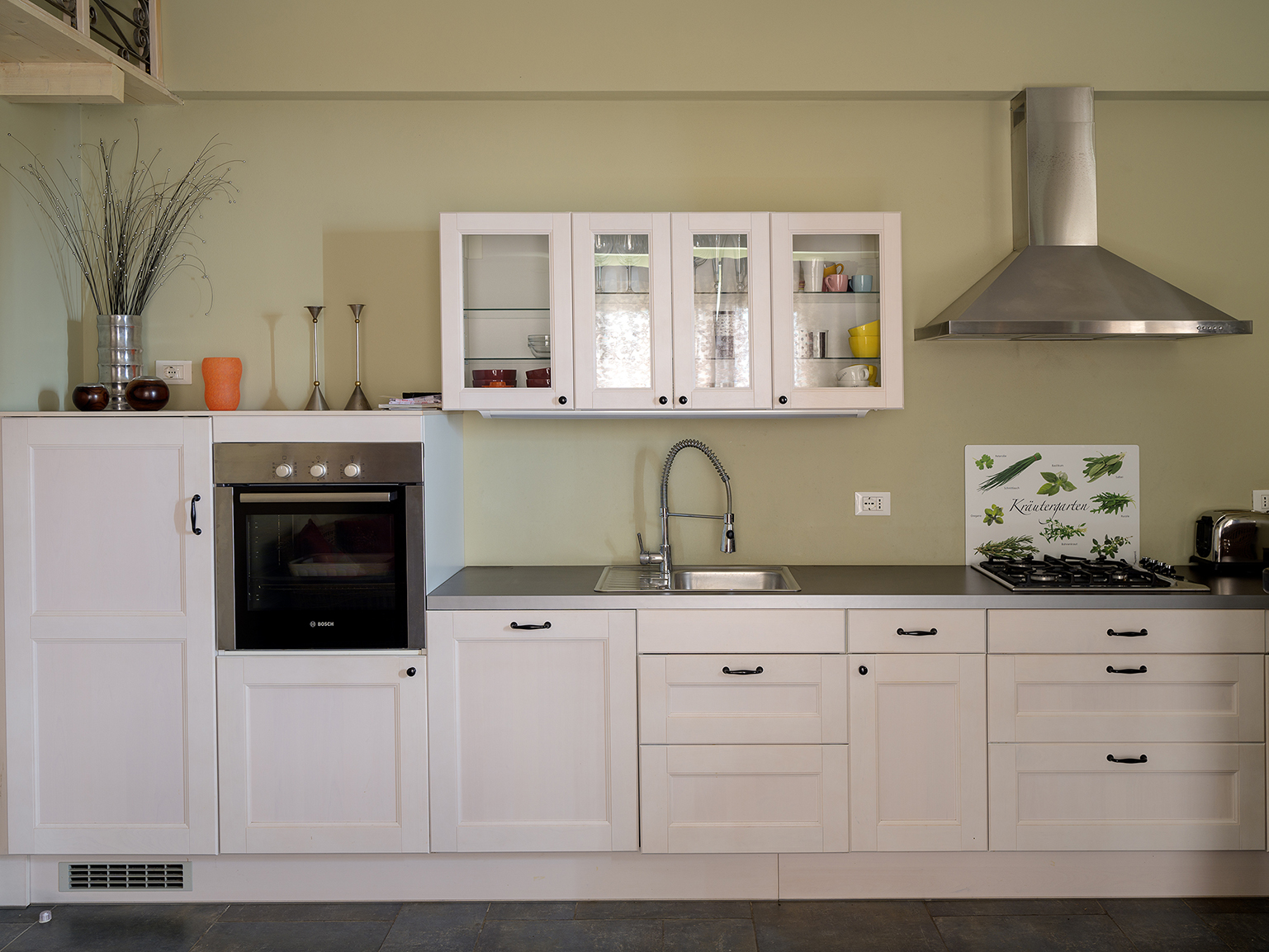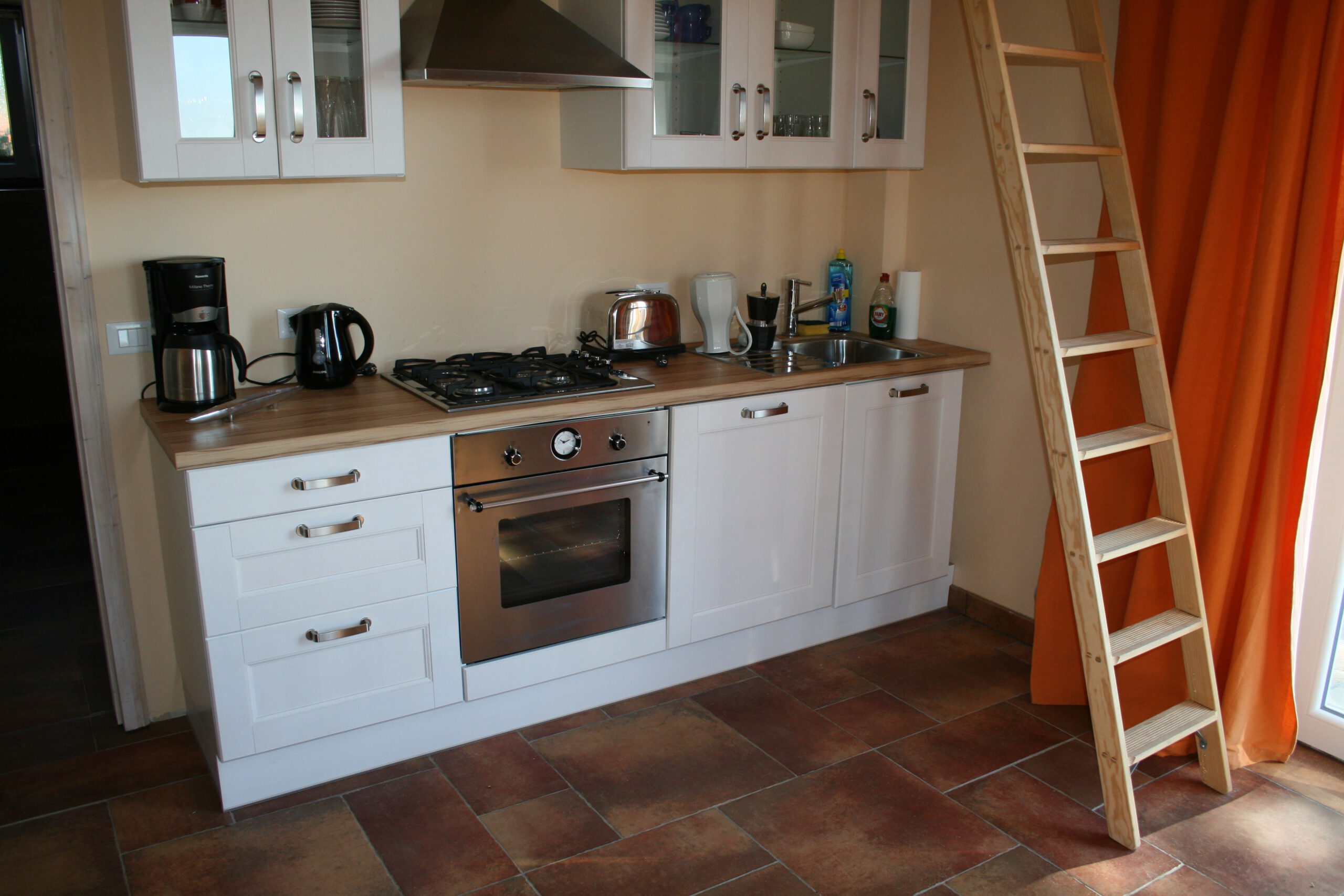 Die Cotto-Fußböden verleihen allen Räumen eine natürliche, erdige Atmosphäre und sorgen für italienisches Wohngefühl. Helle Farben, natürliche Materialien und liebevolle Details bilden ein harmonisches Gesamtbild. Die voll ausgestattete Küche bietet alles, was man zum Kochen und Genießen braucht.