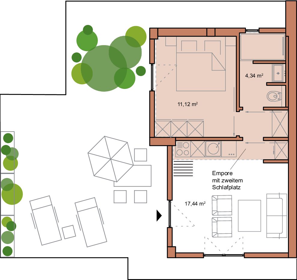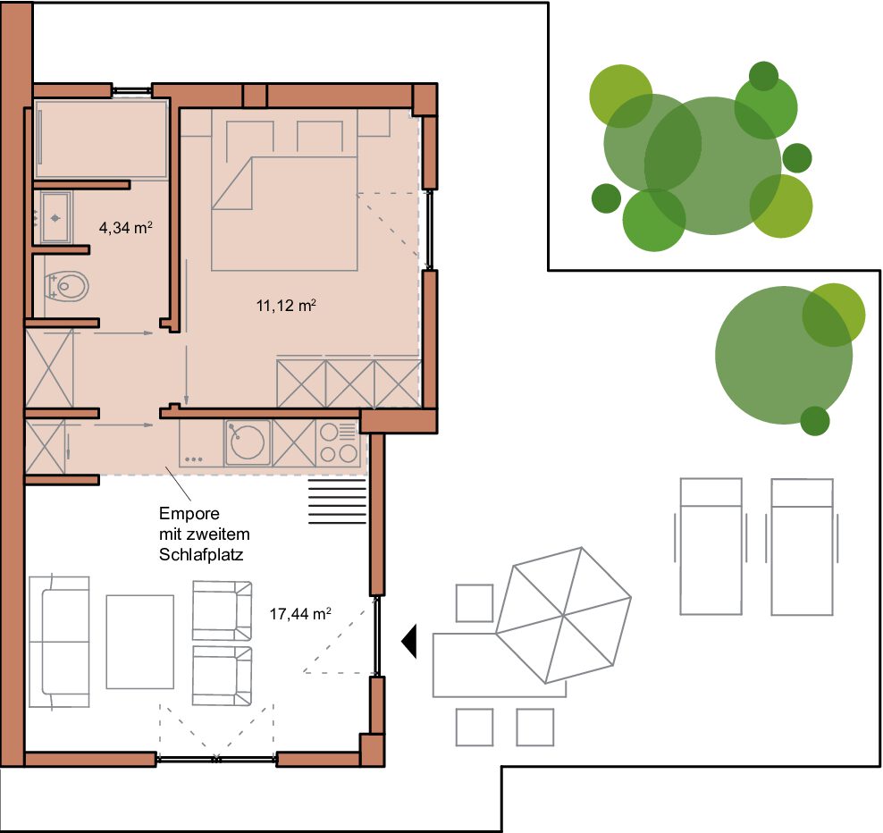 - extra Schlafmöglichkeit auf der Empore über dem Wohnbereich